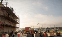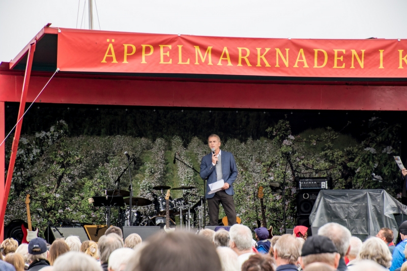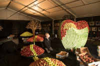 På måndagsmorgonen därefter börjar vi, en numera erfaren och trygg skara, att bygga bilden med ca 12 sorter, ca 35 000 äpplen. En 108 kvadratmeter stor bild ska vi sammanställa, på 5 arbetsdagar. Det är ett arbete som kan utsättas för starka vindar, sol och regn. Också allehanda andra överraskningar, så som det är när en stor grupp människor arbetar under ibland pressade förhållanden. Men vi har lärt oss att veckan är som att segla en skuta, att vi kommer i mål oavsett vad som händer och att vi älskar strapatsen och utmaningen, hur den än ter sig.
